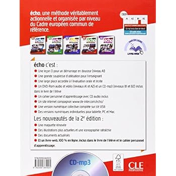 écho, une méthode véritablement actionnelle et organisée par niveau du Cadre européen commun de référénce.écho c'est: une leçon 0 pour un démarrage en douceur (niveau A1) une grande souplesse d'utilisation pour l'enseignant une large place accordée à l'évaluation orale et écrite un DVD-Rom audio et vidéo (niveaux A1 et A2) ou un CD-mp3 (niveaux B1 et B2) inclus dans le livre de l'élève un cahier personnel d'apprentissage avec CD audio inclus un site compagnon www.cle-inter.com/echo/Les nouveautés de la 2e édition: une maquette rénovée des illustrations et une iconographie actuelles des documents mis à jouret un livre-web, 100% en ligne, inclus dans le livre de l'élève et le cahier personnel d apprentissage.