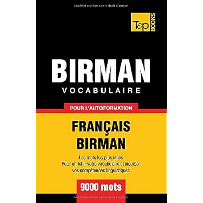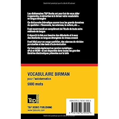 Vocabulaire Français-Birman pour l'autoformation - 7000 motsLes dictionnaires thématiques T&P Books ont pour but de vous aider à apprendre, à mémoriser et à réviser votre vocabulaire en langue étrangère. Ce livre présente, de façon thématique, plus de 9000 mots les plus fréquents de la langue.Spécificités de ce dictionnaire thématique: Les mots sont présentés de manière sémantique, et non alphabétique. Ils sont répartis en trois colonnes pour faciliter la révision et l'auto-évaluation. Les groupes sémantiques sont divisés en sous-groupes pour favoriser l'apprentissage. Le vocabulaire donne une transcription simple et pratique de chaque mot en langue étrangère. Ce dictionnaire comporte 256 thèmes, dont: les notions fondamentales, les nombres, les couleurs, les mois et les saisons, les unités de mesure, les vêtements et les accessoires, les aliments et la nutrition, le restaurant, la famille et les liens de parenté, le caractère et la personnalité, les sentiments et les émotions, les maladies, la ville et la cité, le tourisme, le shopping, l’argent, la maison, le foyer, le bureau, la vie de bureau, l’import-export, le marketing, la recherche d'emploi, les sports, l’éducation, l'informatique, l’Internet, les outils, la nature, les différents pays du monde, les nationalités, et bien d’autres encore ... Ce vocabulaire T&P Books est recommandé en complément de l’étude de toute autre méthode de langue. Répond à la fois aux besoins des débutants et à ceux des étudiants en langues étrangères de niveau avancé. Est idéal pour un usage quotidien, des séances de révision ponctuelles et des tests d'auto-évaluation. Ref. KDP